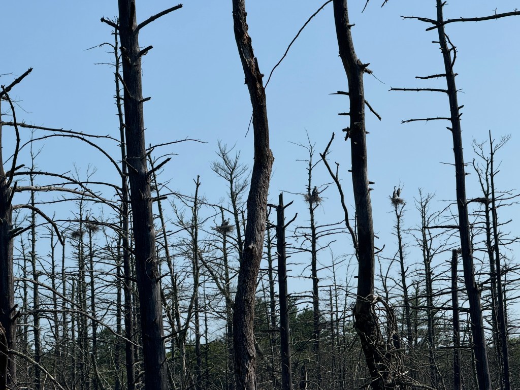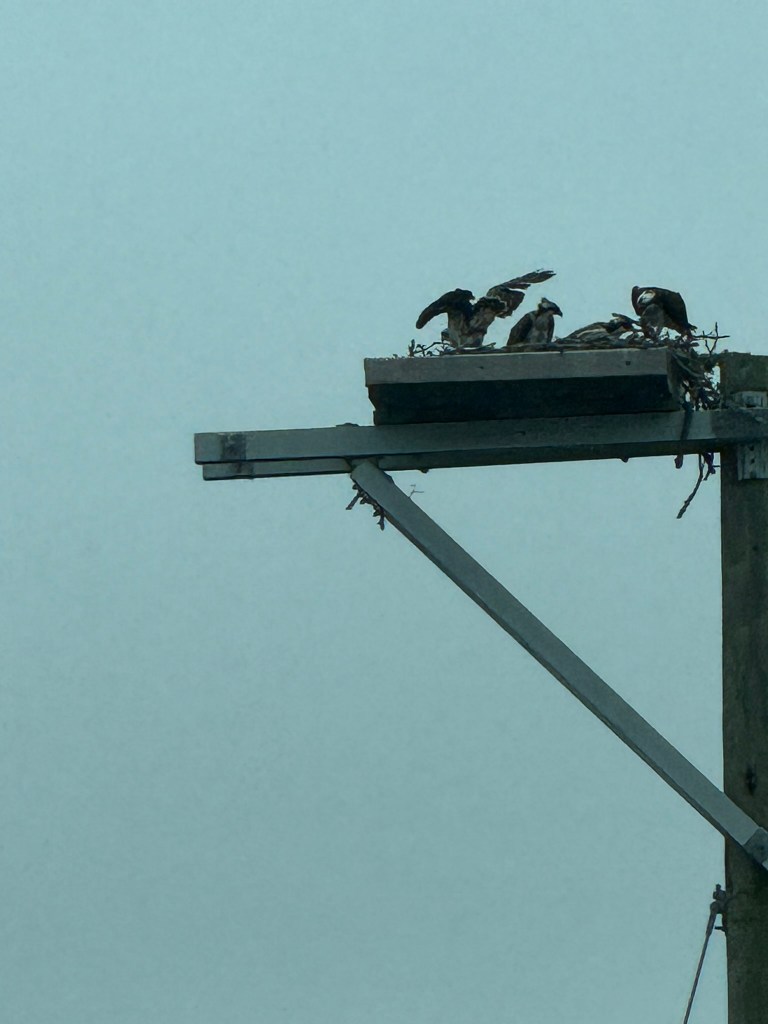 Full Nonquitt Marsh Ospreys 2025 Report. Osprey “Breeding pairs may be solitary or —where food is plentiful and suitable nest sites are few but clustered-birds may form loose breeding colonies, which provides a greater degree of nest defense and perhaps offers adults greater freedom to forage.” — Birds of Prey: Hawks, Eagles, Falcons, and Vultures of North America by Pete Dunne, Kevin T. Karlson.