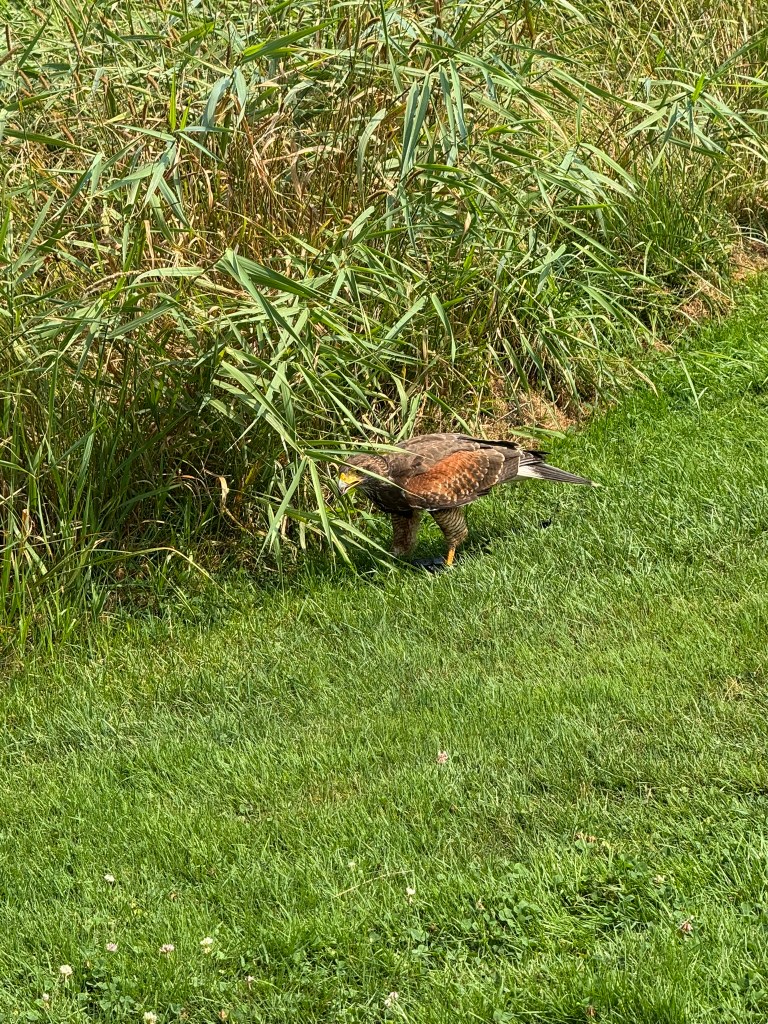 Photo [HRSH01] taken on July 26 of a female Harris’s hawk (non-native to New England) during a beginner falconry course in Hadley, Mass. She was the demonstrator bird, and it was so much fun to watch her. She’d fly off into the trees, with a bell on her leg, and you would hear her come up from behind you. Apparently, last class she killed a catbird right in front of everyone. In the photo, she is hunting for snails, which are abundant in wet summer fields. Harris’s hawks and some other birds of prey can see snail trails through the UV spectrum. Thus making it quite easy for her to collect a bunch.